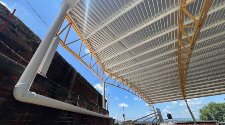 La techumbre metálica no solo protege a los estudiantes de las inclemencias del tiempo, sino que también contribuye a un ambiente de aprendizaje más seguro y cómodo.