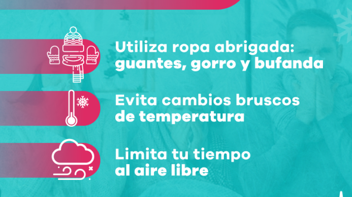 • Usar ropa de abrigo, proteger el rostro y la cabeza, cubrir boca y nariz evitando la entrada de aire frío a los pulmones.