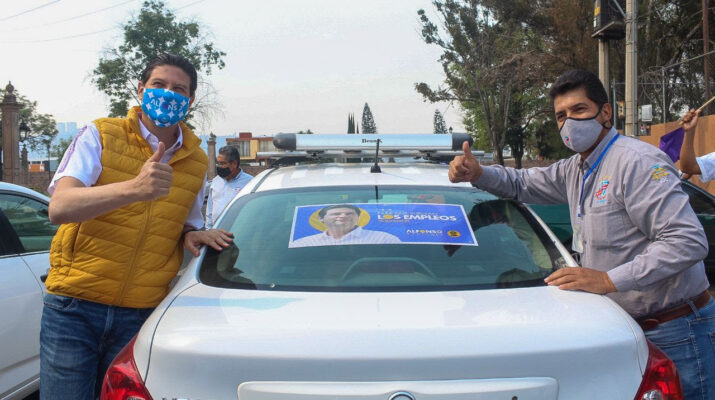Morelia, Michoacán (Digital 3.0). – En medio de porras, banderas y diversas muestras de apoyo, Alfonso Martínez Alcázar, candidato por la alcaldía de Morelia encabezó la pega de calcomanías a unidades de la organización de Radio Taxis “La Huerta”, misma que agrupa a más de 150 unidades.