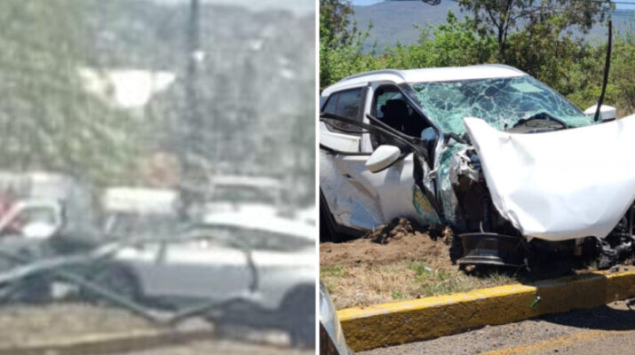 Morelia, Michoacán (Digital 3.0).- Al menos dos personas resultaron lesionadas al chocar el auto en que viajaban contra un poste metálico en la salida a Quiroga, cerca del acceso al fraccionamiento Villa Magna.