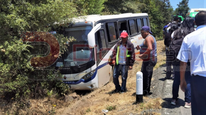 Paracho Mich. (Digital 3.0).- Un autobús de pasajeros, de la línea Purhépechas, se salió de la cinta asfáltica, en una curva que se localiza, entre el entronque a Pomacuarán, y la comunidad de Capacuaro.