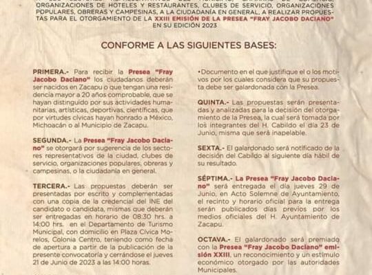 Motivo por el cual invitan a que seas uno de los aspirantes a la Presea Fray Jacobo Daciano 2023 en su XXIII edición, la cual es el máximo galardón que se entrega a las personas destacadas del municipio en distintos ámbitos como artísticos, culturales, deportivos, humanitarios, entre otros.