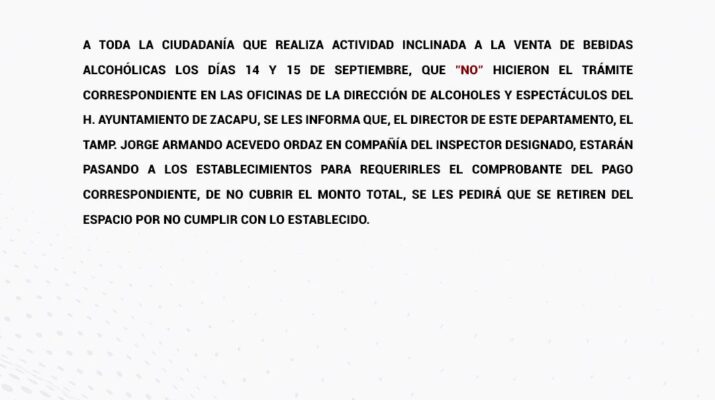El Ayuntamiento de Zacapu, a través de la Dirección de Alcoholes y Espectáculos, informó a los comerciantes que desean vender bebidas alcohólicas durante las celebraciones del 14 y 15 de septiembre, se les requerirá el pago correspondiente del permiso. Para aquellos negocios que no realizaron el trámite en tiempo y forma en las oficinas de dicha dirección se les pedirá que se retiren del espacio.El director de Alcoholes y Espectáculos, Jorge Armando Acevedo Ordaz, realizará los recorridos por los establecimientos para requerir el comprobante de la totalidad del pago por el permiso de venta, quienes no cuenten con el comprobante no tendrán permiso de vender bebidas a base de alcohol en la zona. El Ayuntamiento de Zacapu destacó que estas medidas fueron emitidas para mantener un control en la venta de productos y garantizar la seguridad de la población.