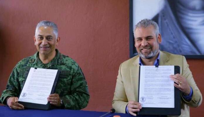 Morelia, Michoacán, (Digital 3.0).- Con el propósito de brindar mayor certeza a elementos del Ejército que cumplen funciones de seguridad en Michoacán, el gobernador Alfredo Ramírez Bedolla firmó un convenio de colaboración con la Secretaría de la Defensa Nacional (Sedena) para brindar un seguro de vida y apoyos económicos a quienes tengan secuelas de salud permanentes derivadas del cumplimiento de su deber.