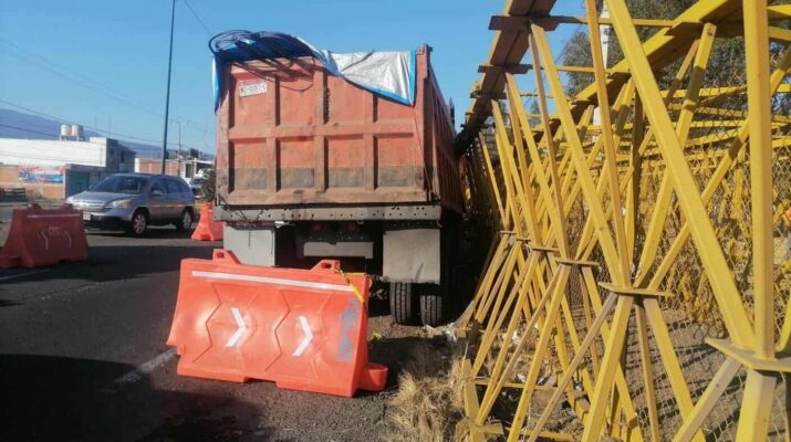 Morelia, Mich.- Viernes 05 de diciembre de 2025.- Un camión tipo volteo, el cual transportaba varilla, se estrelló contra la inservible estructura de un puente peatonal ubicada a la orilla de la avenida Francisco I. Madero Poniente de Morelia, en la salida a Quiroga.