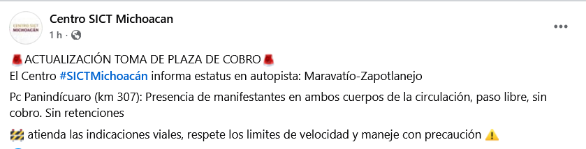 De acuerdo con el Centro SICT Michoacán, los inconformes se mantienen en ambos cuerpos de circulación, permitiendo el paso libre a los automovilistas y sin cobro en la caseta, por lo que se recomienda a los conductores manejar con precaución y respetar los límites de velocidad.