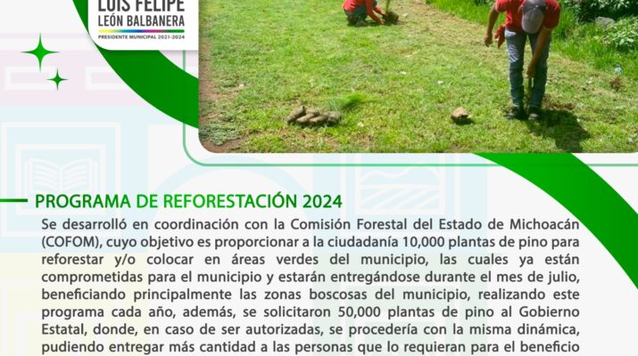 En colaboración con la Comisión Forestal del Estado de Michoacán (COFOM), se ha desarrollado un programa cuyo objetivo principal es proporcionar a la ciudadanía 10,000 plantas de pino destinadas a la reforestación y embellecimiento de las áreas verdes de Zacapu.