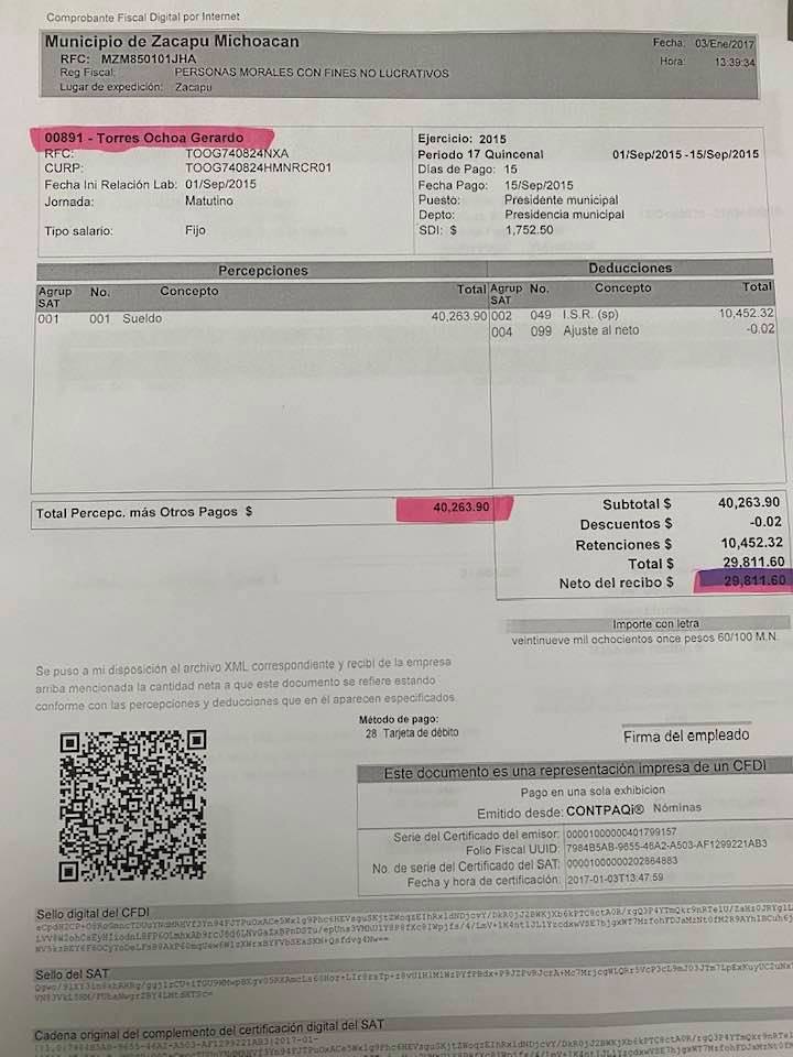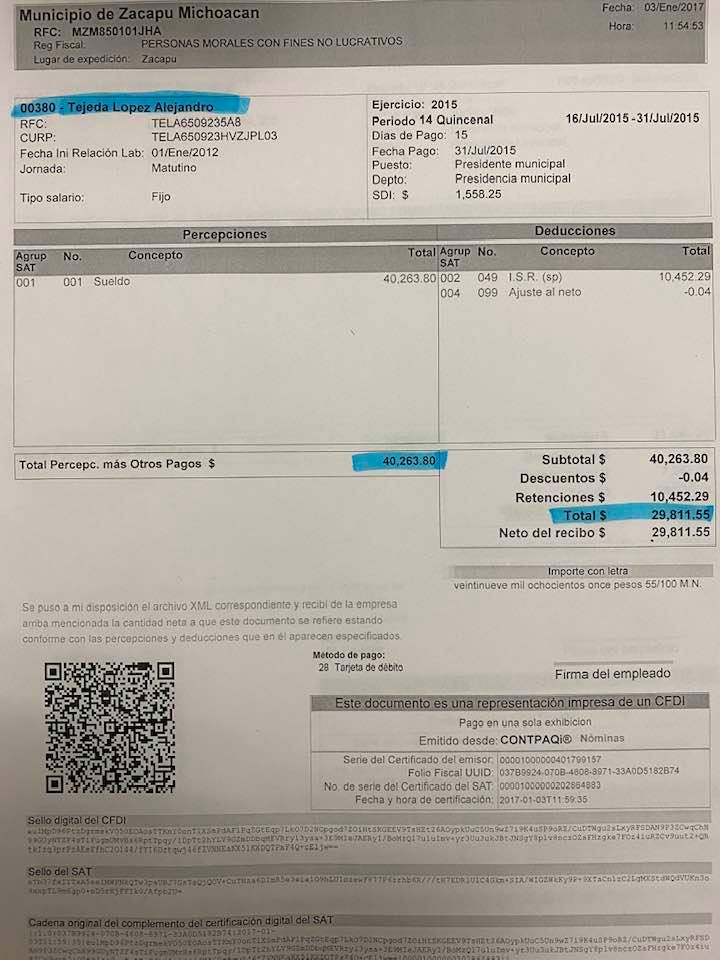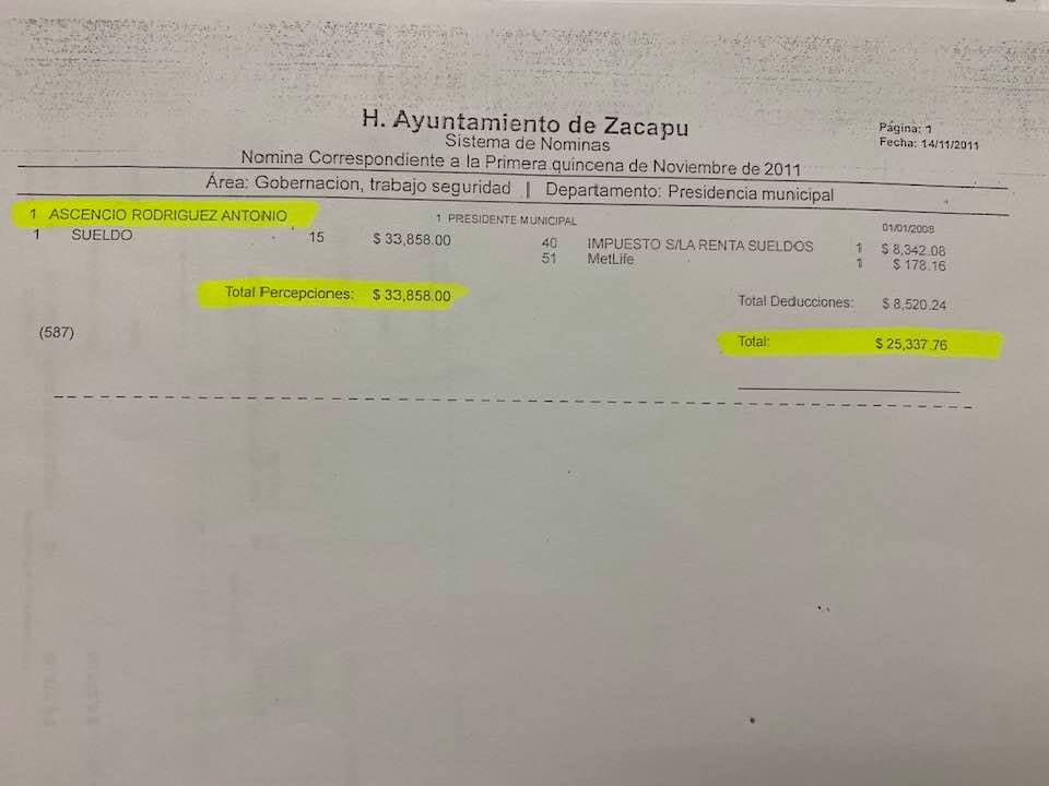 Es por ello que informó y dio a conocer a los ciudadanos su recibo de Nómina así como de los 3 últimos Presidentes de Zacapu el cual les mostramos a continuación: