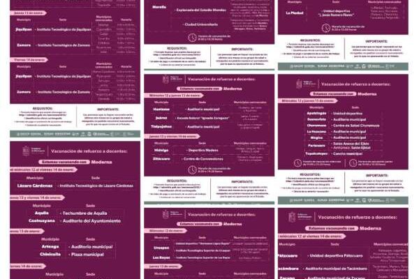 Morelia, Michoacán,(Digital 3.0).- Del 12 al 15 de enero arrancará el refuerzo de inmunización anti COVID-19 en 32 municipios de la entidad, para las y los más de 100 mil docentes michoacanos.