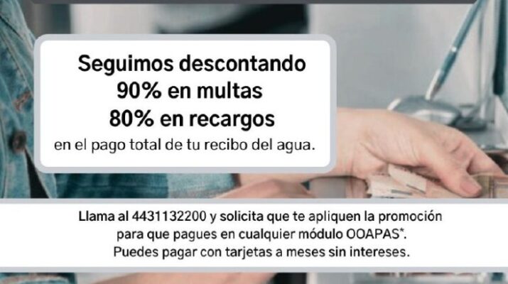 Morelia, Michoacán (Digital 3.0).- El Organismo Operador de Agua Potable, Alcantarillado y Saneamiento de Morelia (OOAPAS) contará con dos programas de descuentos durante los meses de julio y agosto: uno es el programa “Ya lo pasado, pasado… dile adiós a tu deuda del agua”, que ofrece descuentos en adeudos de 60 meses o más, con la finalidad de que los usuarios con gran rezago puedan ponerse al corriente; el otro es el programa “Ponte al Corriente”, el cual seguirá vigente con descuentos en multas y recargos a los usuarios que paguen la totalidad de sus adeudos de agua.