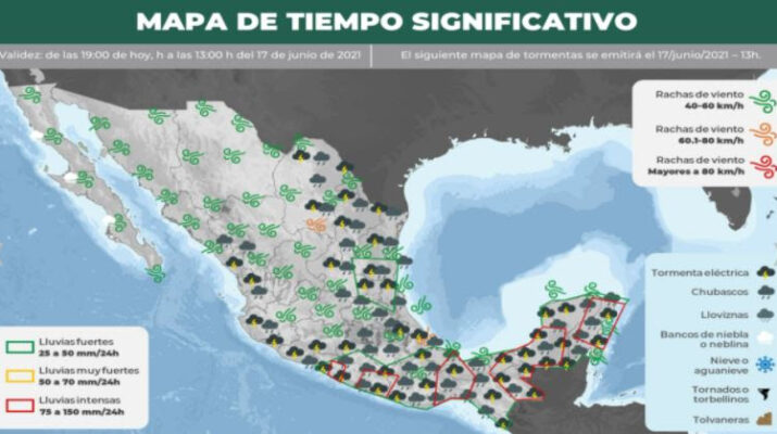 Con información del Servicio Meteorológico Nacional (SMN), una segunda zona de baja presión con probabilidad para desarrollo ciclónico en el Océano Pacífico originará lluvias fuertes a muy fuertes, descargas eléctricas y posibles granizadas además de oleaje elevado a lo largo de la zona costera.