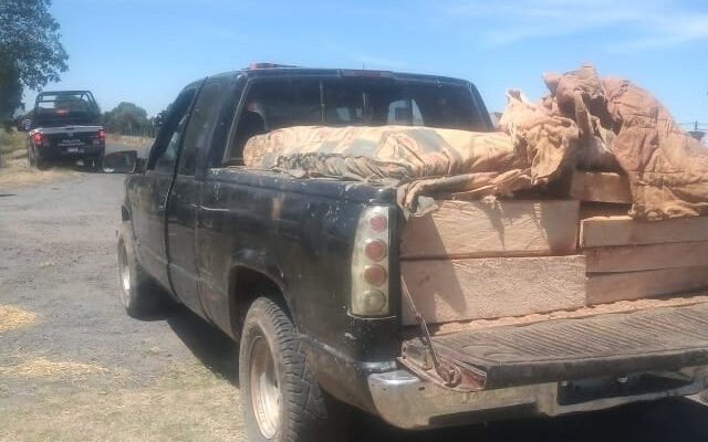 Derivado de un reporte, elementos de la Policía Michoacán ubicaron en un tramo carretero de este municipio una camioneta, la cual se encontraba cargada con diversos trozos de madera, sin que se acreditara la legal procedencia de la carga.