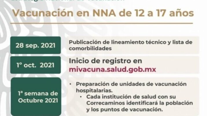 Morelia, Mich. (Digital 3.0)– En octubre iniciará la campaña para vacunar contra COVID-19 a Niños, Niñas y Adolescentes (NNA) de 12 a 17 años, aunque sólo será a aquellos que tengan alguna comorbilidad, así como a las adolescentes embarazadas, según dio a conocer la Secretaría de Salud del Gobierno de México.