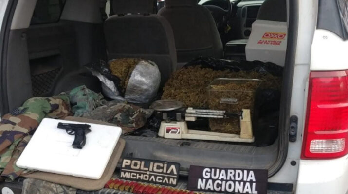 Uruapan, Mich, (Digital 3.0).- Como resultado de la implementación de un operativo interinstitucional llevado a cabo por los elementos de la Secretaría de Seguridad Pública (SSP) y de la Guardia Nacional (GN) se logró la detención de tres personas del sexo masculino, quienes se encontraban en posesión de hierba verde y seca con las características propias de la marihuana, cartuchos útiles, equipo táctico y una réplica de un arma de fuego.