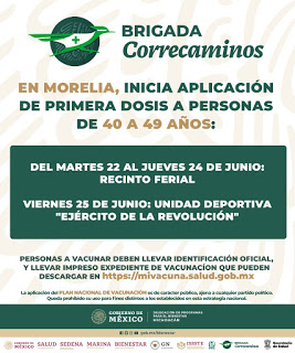 Morelia, Michoacán (Digital 3.0).– Este martes 22 de junio iniciará la vacunación contra COVID-19 a personas de 40 a 49 años de edad y mujeres embarazadas mayores de 18 años, en Morelia.
