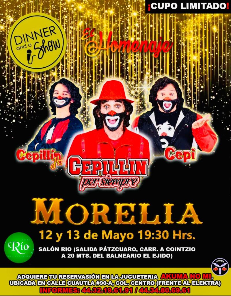 El homenaje a Cepillín en Morelia se llevará el próximo 12 y 13 de Mayo con una cena show de manera privada y cupo limitado acatando todas las medidas sanitarias, el costo por reservación será de $400.