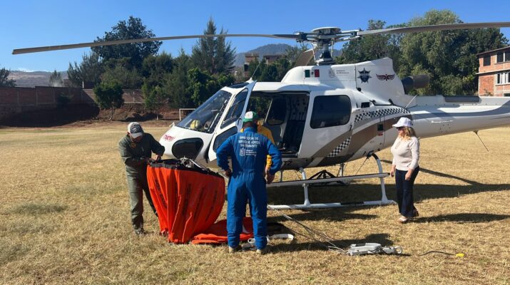 Morelia, Michoacán, 24 de marzo de 2023.- Por instrucciones del gobernador Alfredo Ramírez Bedolla, se inició el operativo de apoyo aéreo con el helicóptero, equipado con el helibalde, para combatir el incendio forestal que se registra en el municipio de Cotija, para complementar la actividad terrestre.