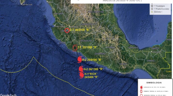 Al corte de las 10:00 horas de este domingo, el meteoro categoría 1 se ubica a 180 kilómetros al sur de Zihuatanejo, Guerrero, y a 220 kilómetros al sur-sureste del puerto de Lázaro Cárdenas.