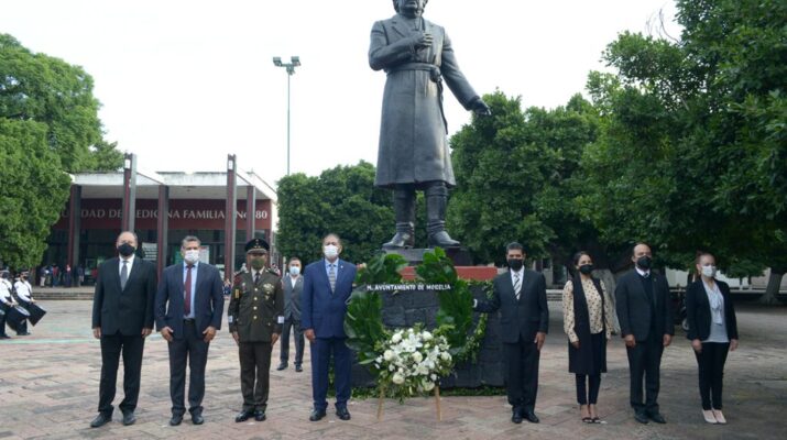 Morelia, Michoacán (Digital 3.0). – En conmemoración del CCX aniversario luctuoso de Don Miguel Hidalgo y Costilla, el Gobierno de Morelia realizó un izamiento de bandera en la Plaza Melchor Ocampo y posteriormente, el depósito de la ofrenda floral y guardia de honor en la plaza que lleva el nombre del caudillo de la Independencia.