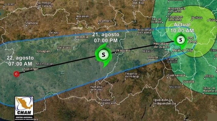 Actualmente presenta vientos sostenidos de 110 km/h con rachas de hasta 135 km/h, siendo una Tormenta Tropical. Gradualmente se debilitará mientras se desplaza sobre #Hidalgo, #Edomex, #Tlaxcala, #CDMX, #Morelos y #Michoacán.