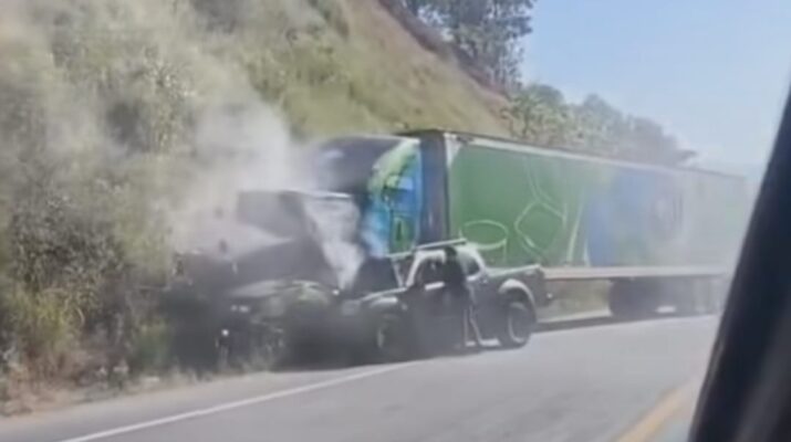 Uruapan, Mich.- 04 de noviembre de 2025.- Un hombre pereció prensado y dos más resultaron murió prensado tras el choque entre una camioneta y un tráiler la mañana de este martes sobre la autopista Siglo XXI, en el tramo Uruapan-Pátzcuaro.
