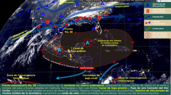 De acuerdo con el Servicio Meteorológico Nacional (SMN) se espera que el frente frío número 38 deje de afectar la entidad en el transcurso de la noche, por otro lado un sistema de alta presión en niveles medios de la atmósfera, mantendrá una onda de calor, lo que provocará temperaturas máximas de 40 a 45°C en los municipios de la región de tierra caliente.