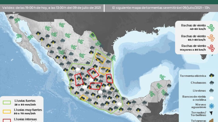 De acuerdo con el Servicio Meteorológico Nacional, la onda tropical Número 8 y canales de baja presión provocarán lluvias fuertes con descargas eléctricas y posible caída de granizo.