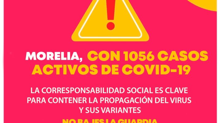 Morelia, Michoacán (Digital 3.0).- Con mil 56 casos activos, Morelia es el epicentro de la tercera ola de COVID-19. Acumula 17 mil 508 confirmados, de los cuales mil 668 han perdido la batalla contra la enfermedad.