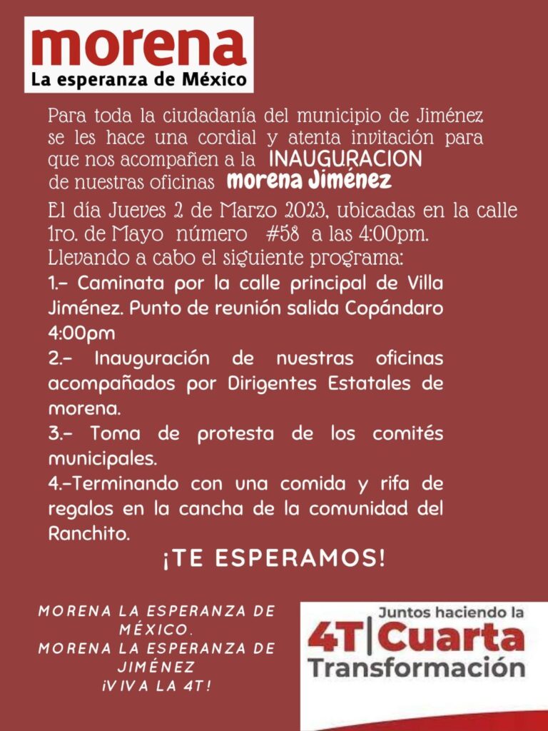 Muestra de ello es la próxima apertura y toma de protesta del nuevo comité municipal en Villa Jiménez la cual se realizará el 2 de Marzo donde todos están invitados a participar en un recorrido por la calle principal de Jiménez partiendo de la salida a Copándaro.
