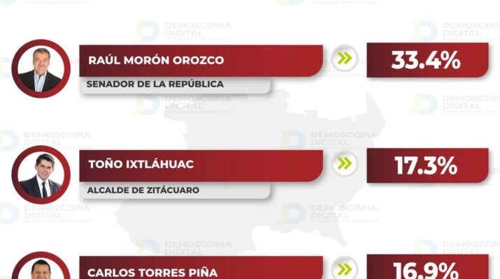Morelia, Mich., a 22 de agosto de 2025.- Raúl Morón Orozco se consolida como el perfil favorito por los michoacanos para ser el candidato de Morena por la gubernatura de Michoacán, de acuerdo a la más reciente encuesta de Demoscopia Digital, que le otorga un 33.4% de las preferencias; ejercicio que también confirma la caída de Carlos Torres Piña, quien a pesar de una intensa actividad y campaña en medios de comunicación tras su designación como Fiscal General del Estado, no logró incrementar sus números.