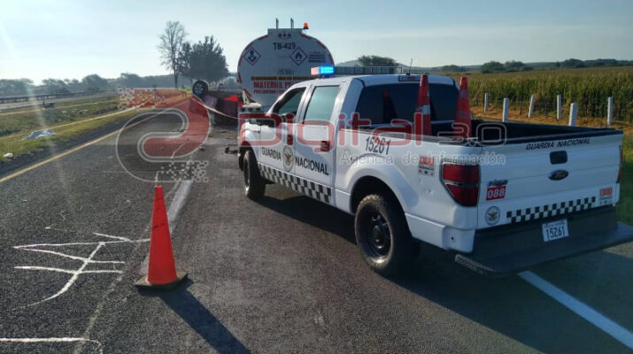 Información obtenida por este medio señala que en el kilómetro 387+000 de la tambien conocida como Autopista de Occidente colisionaron un camioneta Pick up, marca Toyota, rojo, 2017 con placas NEH1017 del Estado de México, y un Tracto camión, Kenworth, color blanco, modelo 2017 y placas: 45AF9V. el cual remolcaba dos tanques pipa.