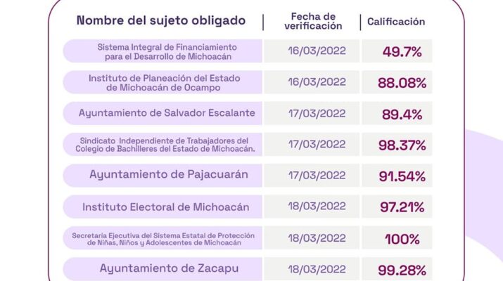 Califica en su periodo de revisión, como el 2° de los mas cumplidos, al municipio de Zacapu, con un 99.28% de evaluación, según datos de dicho instituto.