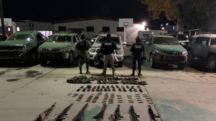De igual forma, durante las tareas efectuadas en zonas serranas, se localizaron tres campamentos relacionados en conductas ilícitas, ubicando en uno de estos 6 vehículos, 7 armas de fuego de diversos calibres, 574 cartuchos útiles, 26 cargadores y equipo táctico.