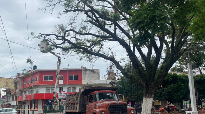 Zacapu, Mich; 16 de agosto 2022.- Personal del departamento de parques y jardines lleva a cabo la poda de los árboles de la plaza principal de esta ciudad, esto como una medida para seguridad de la población.