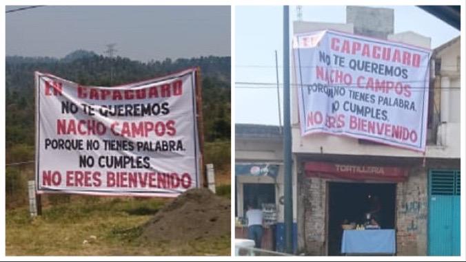 Uruapan, Mich. (Digital 3.0).- Habitantes de la comunidad indígena de Capacuaro, perteneciente al municipio de Uruapan, colocaron mantas en la entrada del pueblo y varias calles del mismo, en las cuales expresan su rechazo al candidato del Movimiento de Regeneración Nacional (Morena) y el Partido del Trabajo (PT), Ignacio Campos al que señalan de mentiroso.