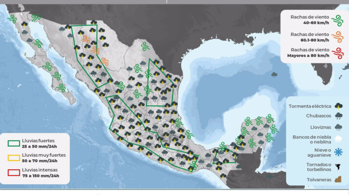 • Extremar precauciones por viento con rachas superiores a 60 kilómetros por hora, torbellinos y/o tolvaneras poniendo especial atención a construcciones de material endeble, así como posibles afectaciones en espectaculares y tendido eléctrico.