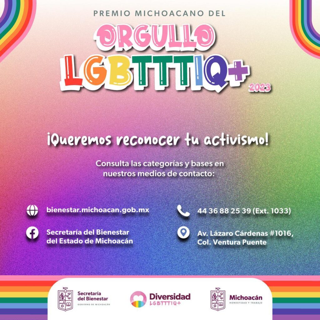 Morelia, Michoacán, 28 de junio de 2023.- Por primera vez en la historia del Gobierno de Michoacán, la Secretaría del Bienestar (Sedebi) reconocerá el activismo de quienes trabajan en la defensa de los derechos humanos de la diversidad sexual, a través del Premio Michoacano del Orgullo LGBTTTIQ+ 2023.
