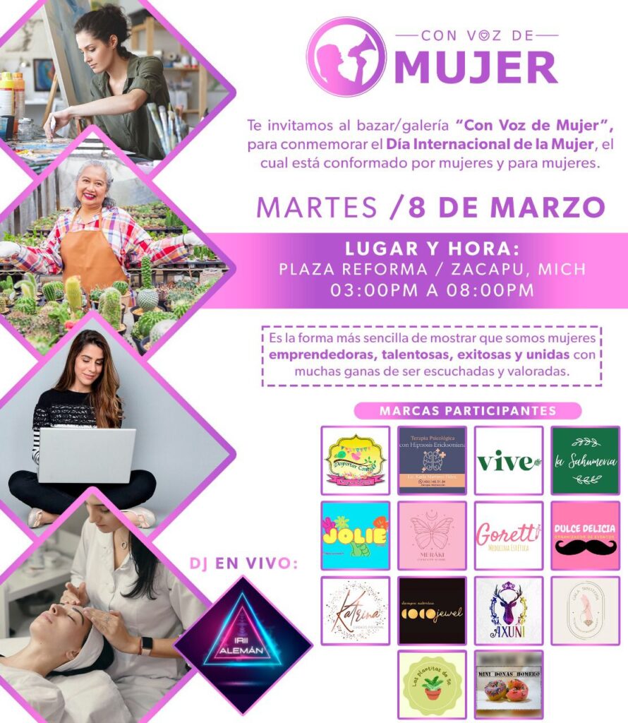 Zacapu Mich. (Digital 3.0).- Por primera vez en Zacapu se realizará el Bazar/Galería «Con Voz de Mujer», con el cual conmemorarán el Dia Internacional de la Mujer.