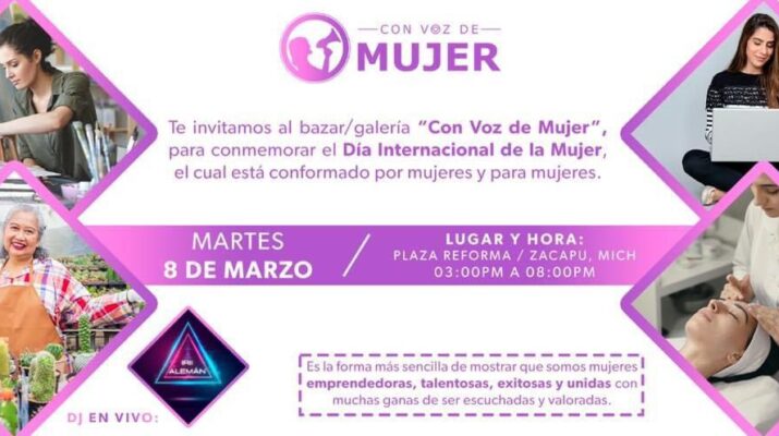 Zacapu Mich. (Digital 3.0).- Por primera vez en Zacapu se realizará el Bazar/Galería «Con Voz de Mujer», con el cual conmemorarán el Dia Internacional de la Mujer.