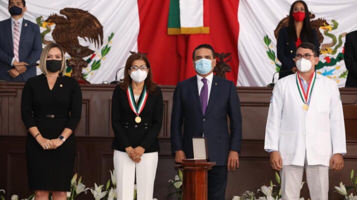 En Palacio Clavijero, el mandatario estatal y los legisladores condecoraron a Francisco Lunar Vargas (post mortem), doctor que ante la emergencia sanitaria continúo su trabajo en los hospitales y al enfermar perdió la vida en la batalla contra el virus Sars-CoV2.