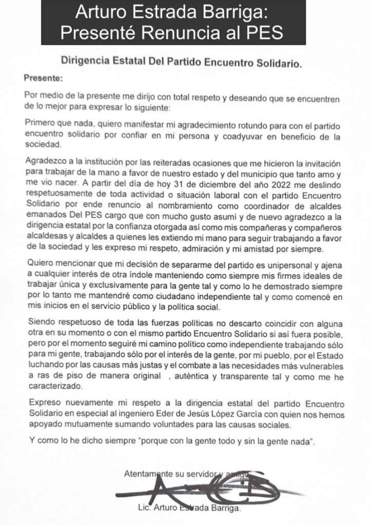 Quiroga Mich. (Digital 3.0).- Este sábado a través de un Comunicado el Presidente de Quiroga anunció su renuncia al Partido Encuentro Solidario (PES), el cual lo llevó al triunfo en su municipio.
