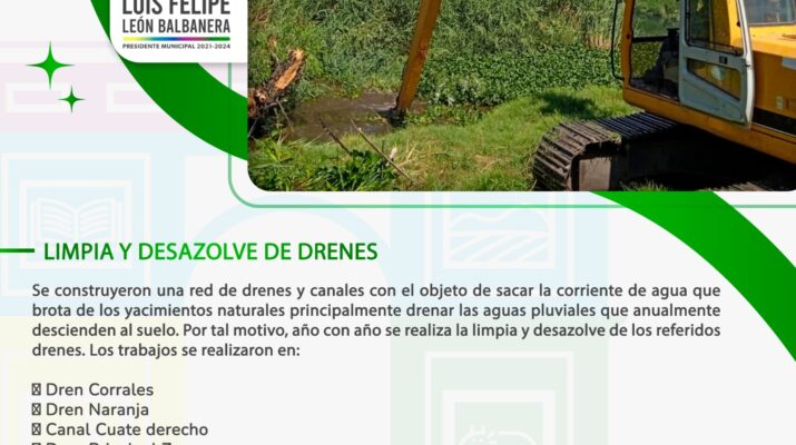 – En el marco del tercer informe de gobierno del presidente municipal, Lic. Luis Felipe León Balbanera, la Dirección de Desarrollo Rural, bajo la dirección del Ing. Abraham López, presenta un detallado informe de las actividades realizadas durante el último año en la limpieza y desazolve de drenes en el municipio de Zacapu.