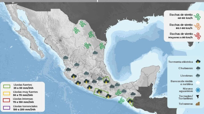Con información del Servicio Meteorológico Nacional, un canal de baja presión que se extenderá sobre el occidente y centro de México, así como por el flujo de humedad proveniente del Océano Pacífico y el Golfo de México, provocarán lluvias fuertes, de 25 a 50 milímetros, con posible caída de granizo y descargas eléctricas
