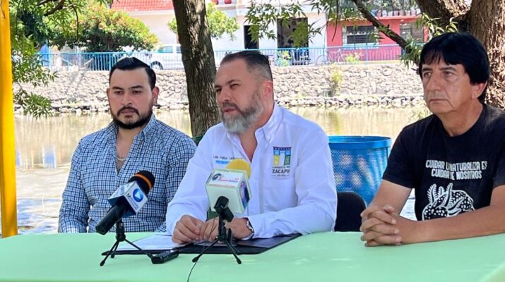 Zacapu Mich., 06 de junio del 2023.- Esta mañana en rueda de prensa el presidente municipal, Lic. Luis Felipe León Balbanera, acompañado por el director de ecología y medio ambiente, así como el representante del director de la institución educativa CECATI 38, en el cual informó que se están realizando trabajos de desazolve en el estanque mayor del parque La Zarcita.