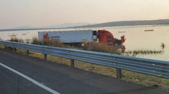 Cuitzeo, Mich. (Digital 3.0/RED113).-Un tráiler se salió de la carpeta asfáltica y cayó al Lago de Cuitzeo, donde quedó atascado; por fortuna la unidad no volcó y su ocupante resultó ileso, mencionaron fuentes allegadas al tema.
