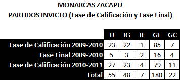 Si la racha de juegos sin descalabro se centrara solamente en partidos válidos por la Fase de Calificación, Monarcas Zacapu tendría un número mayor, pues desde mediados de la campaña 2008-2009 hasta los inicios de la 2011-2012, alcanzaron 63 cotejos sin conocer el descalabro, en los que alcanzaron 55 victorias y 8 empates, con 202 goles a favor y 30 goles en contra.
