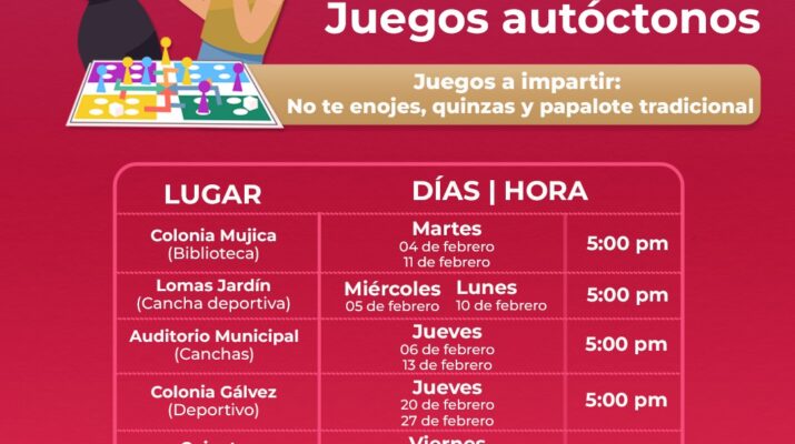 Está actividad se realizará en diferentes zonas del municipio como en la Biblioteca de la Colonia Mújica los días martes 4 y 11 de febrero a las 5pm; en la Cancha Deportiva de Lomas Jardín el miércoles 5 y lunes 10 de febrero a las 5pm.